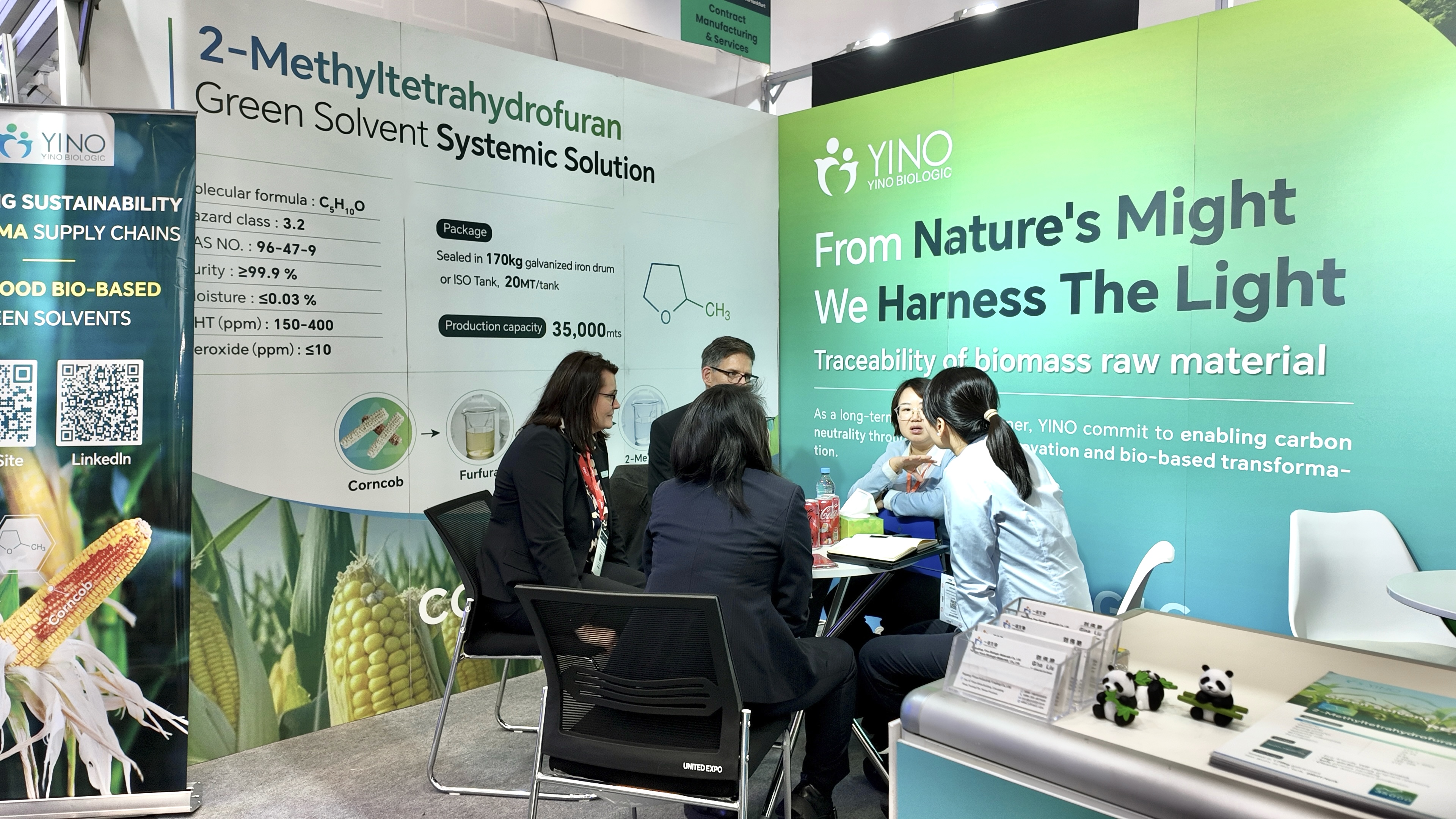 在制藥生產(chǎn)中,溶劑與原料的選擇不僅關(guān)系到工藝的安全性與環(huán)境友好性,更直接影響藥物純度和生產(chǎn)效率。YINO Biologic 以非糧生物質(zhì)玉米芯為原料,從源頭實現(xiàn)碳減排與資源高效利用,構(gòu)建了覆蓋從原料到終端制造的綠色供應鏈。本次展會上,公司重點展示了多款高性能可持續(xù)產(chǎn)品,包括可作為活性藥物成分(API)合成綠色溶劑的 2-Methyltetrahydrofuran(2-MeTHF),該產(chǎn)品可有效替代傳統(tǒng) THF,顯著降低揮發(fā)性有機物排放并提升反應安全性與效率;用于高端藥物保護基及精細化工中間體合成的關(guān)鍵原料 3,4-Dihydro-2H-Pyran(DHP);以及新一代高純度環(huán)狀酯原料 δ-Valerolactone(δ-VL),廣泛應用于藥物輔料及聚合物開發(fā)領(lǐng)域,充分展現(xiàn)了 YINO 在綠色化學與可持續(xù)材料創(chuàng)新方面的實力。